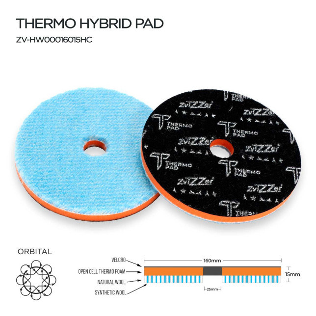 Les Thermo Hybrid Pads combinent laine naturelle (carnauba/mouton) et laine synthétique dans une formulation équilibrée unique. Cette hybridation offre la puissance de coupe agressive de la laine naturelle avec la durabilité, la finition améliorée et le contrôle accru de la laine synthétique. Le résultat est un pad offrant excellente correction avec moins d'hologrammes que la laine pure, tout en restant plus agressif que les pads mousse standards.
