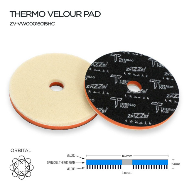 Les Thermo Velour Pads utilisent une surface velours douce au lieu de mousse, offrant plusieurs avantages: finition exceptionnellement douce sans hologrammes, capacité de coupe modérée bien contrôlée, excellent pour peintures tendres et délicates, génération minimale de chaleur, résultats prévisibles constants et sécurité accrue pour utilisateurs moins expérimentés. Le velours crée une interface plus douce entre le pad et la peinture, idéale pour finitions impeccables.